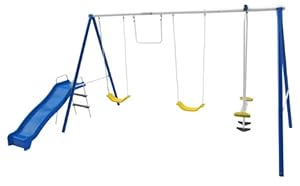 The Flexible Flyer Swing Free Metal Swing Set will provide backyard fun all summer long. This swing set allows your kids to play and get some exercise at the same time. It comes with four different activities that can keep up to six kids busy and active. The sturdy, steel frame of this backyard swing set is built to last and can have parents feeling confident that their kids are safe. The swings, trapeze swing, air glider and slide provide plenty of opportunities for outdoor fun.